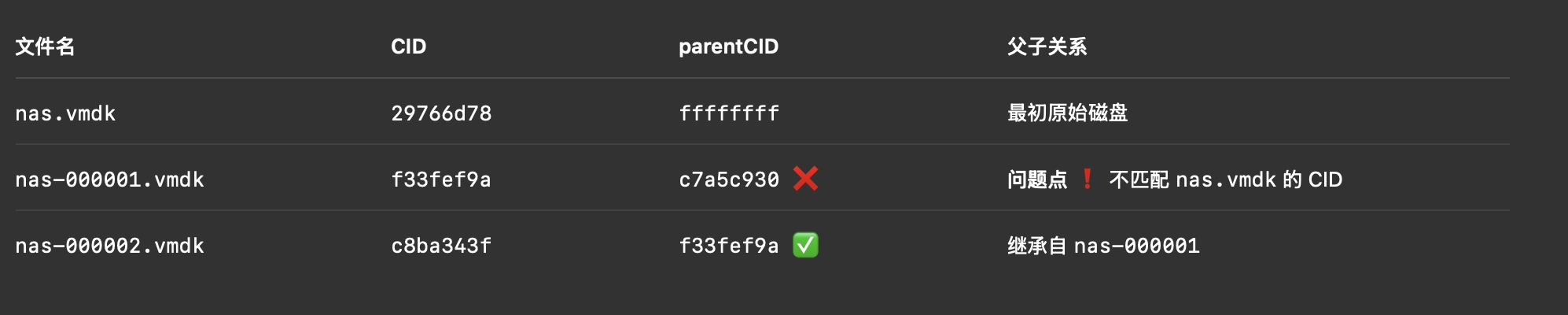 进入 ESXI Shell 编辑 .vmx 文件,修复parentCID